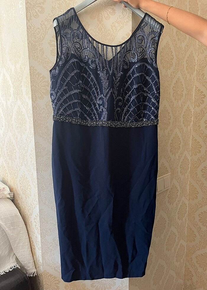 Lacivert işlemeli abiye