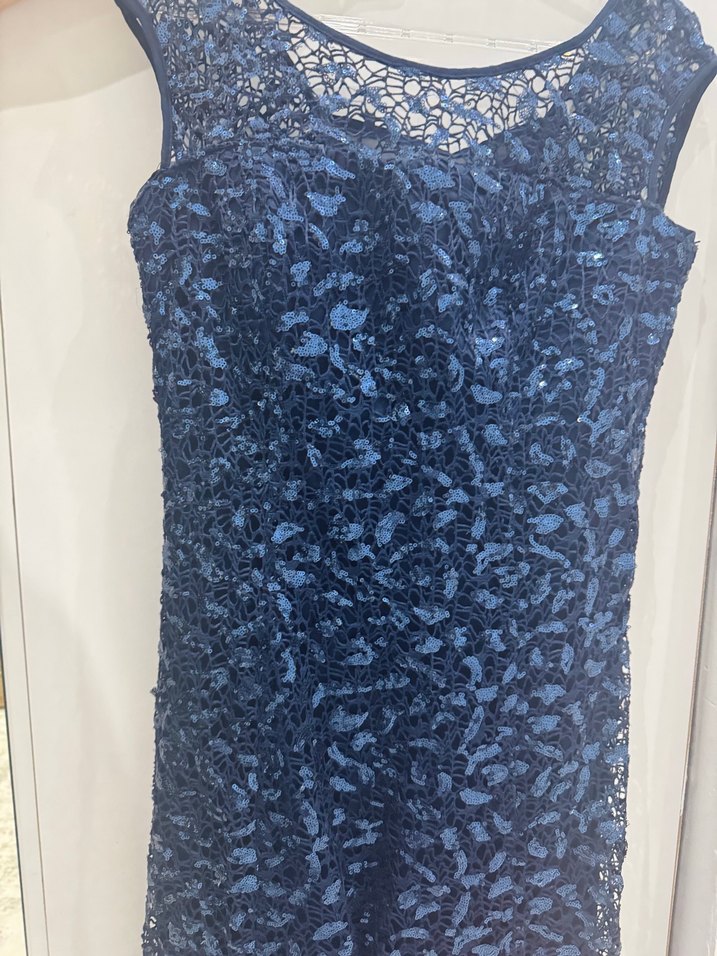Kolsuz,V yaka, işlemeli dantel detaylı, lacivert uzun ve vücuda oturan abiye elbisedir. Etiketi 46 beden ancak 42-44 bedene uyumludur.
