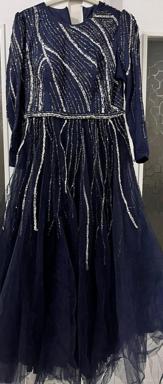 Lacivert uzun abiye elbise, pileli etek ve detaylı işlemelere sahip. Vücuda oturan kesim, kayık yaka ve ince askılı kollardır. Düğünler için uygundur. ✨