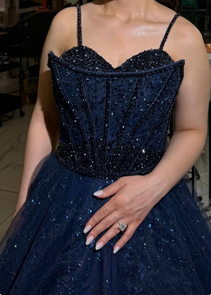 Lacivert İşlemeli Parlak Nişan Elbisesi