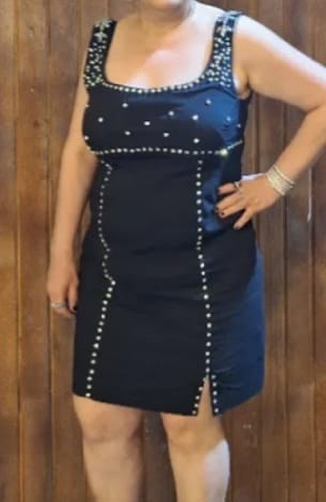 Lacivert, v yakalı ve ince askılı, taşlı ve işlemeli detaylarla süslenmiş, dar kesim midi elbise. Romantik akşamlar için ideal. ✨
