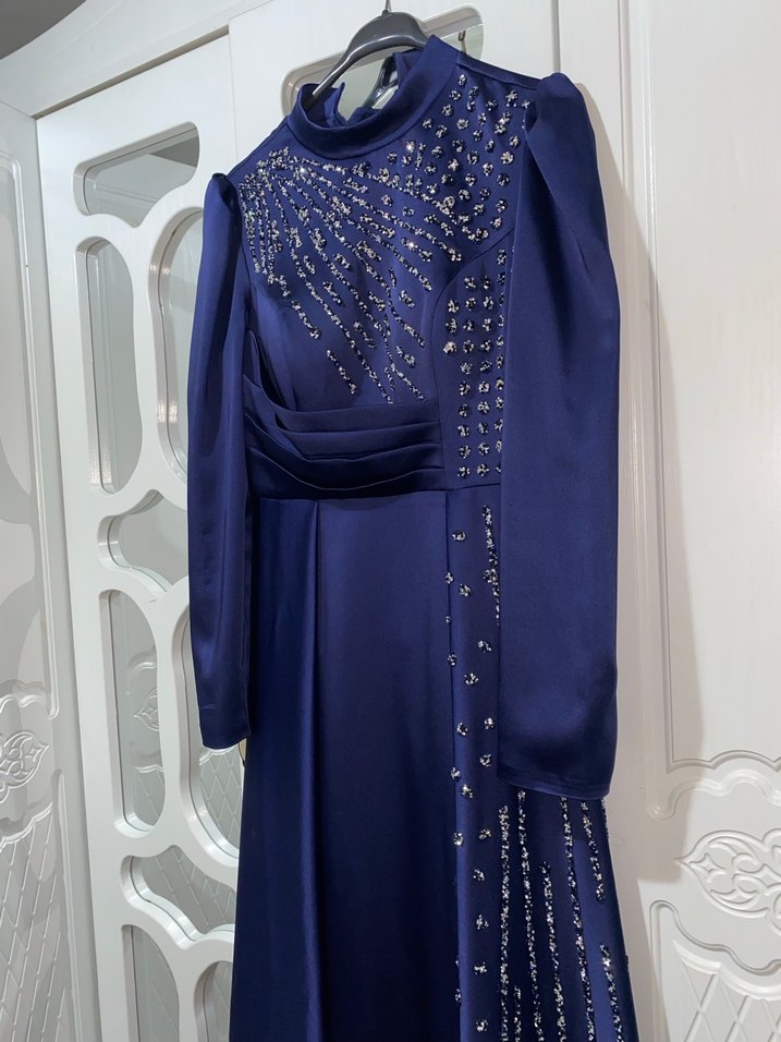 Lacivert uzun abiye elbise, yüksek yakalı, uzun kollu ve düzenli kesimdir. Zarif drapeli detaylar ve parlak işlemeler içerir. Düğünler için uygundur. ✨