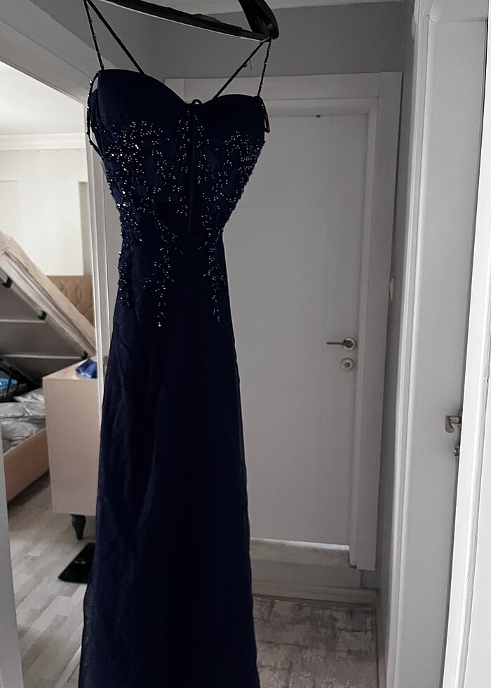 Lacivert işlemeli bir defa giyildi uzun tül etekleri olan askısında boncuk işlemesi olan elbise