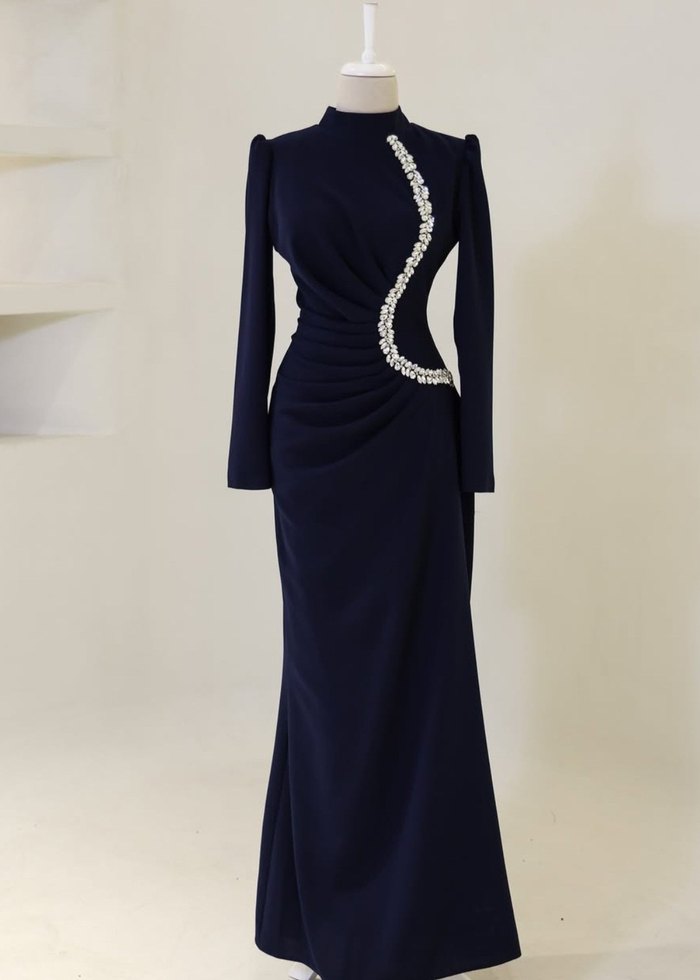Lacivert uzun kollu, yüksek yakalı abiye elbise. Drapeli tasarım ve işlemeli detaylarla modern klasik bir görünüm sunar. Düğünler için uygun.