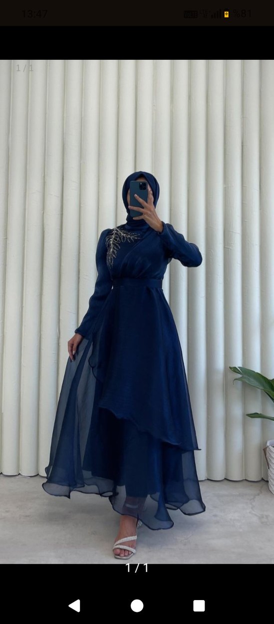 Lacivert uzun kollu, yüksek yakalı, bol kesim ve drapeli işlemeli abiye elbise, düğün için uygundur. sıfır hiç kullanılmamıştır farklı renk ve bedenleri mevcuttur