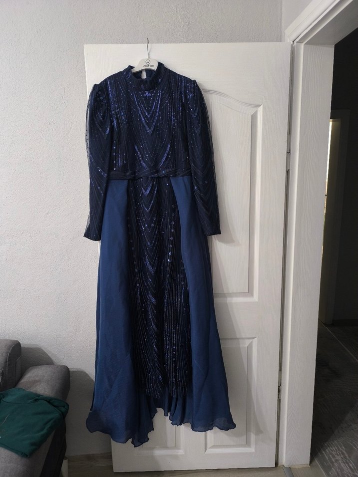 Lacivert İşlemeli Uzun Kollu Abiye Elbise