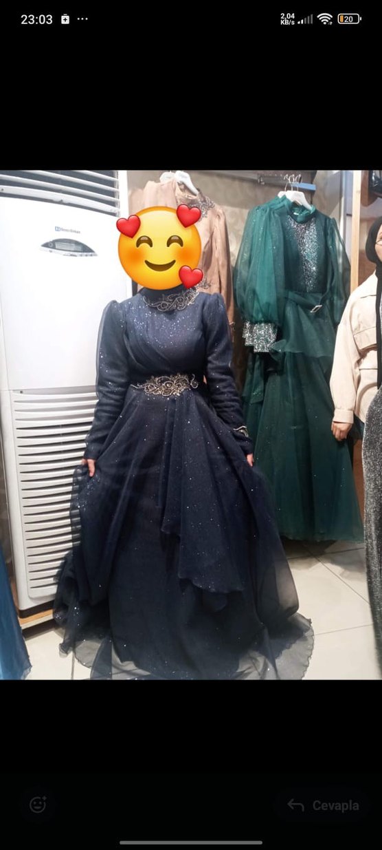 Lacivert renkli, uzun kollu ve yüksek yakalı bu dar kesim abiye elbise, işlemeli detaylarıyla düğün ve gotik şıklık için uygundur.