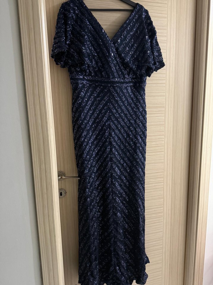 Lacivert uzun abiye, drapeli ve işlemeli desenlere sahip. V yaka ve kısa kollu, klasik şıklıkta. Yalnızca 1 kez kullanıldı.