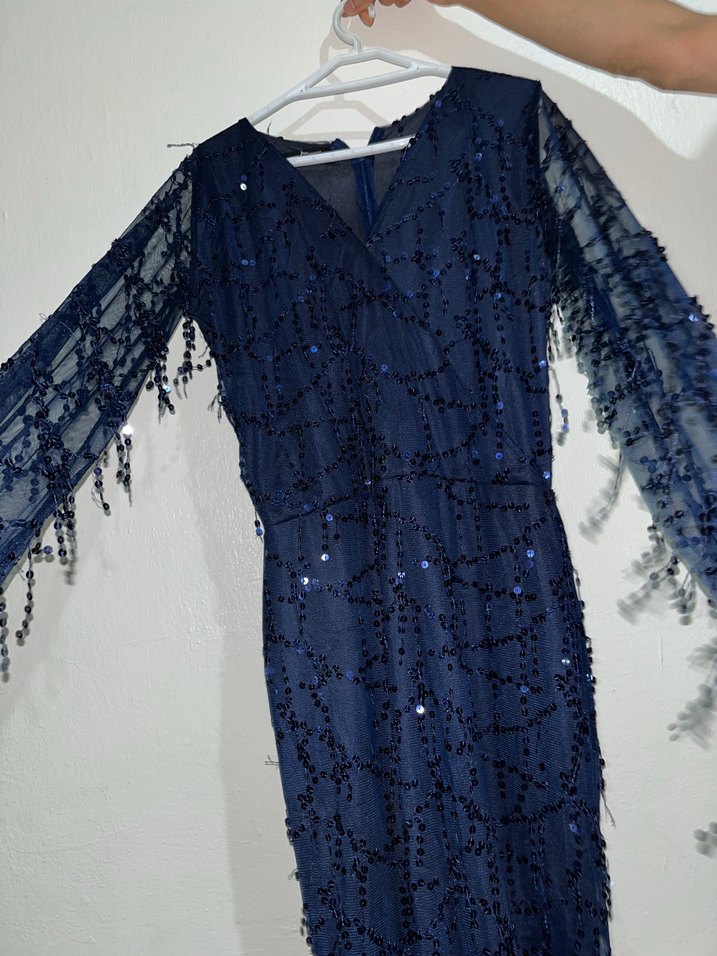 Lacivert uzun abiye elbise, V yaka ve uzun drapeli kollara sahip. İşlemeli detaylar, bohem ve gösterişli tarzı tamamlar. Parti için uygundur. ✨