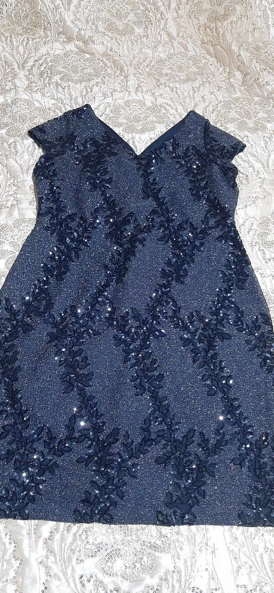 V yaka, kolsuz ve işlemeli dantelli, parlak lacivert uzun abiye elbise, fit kesimle parti şıklığı sunar. ✨