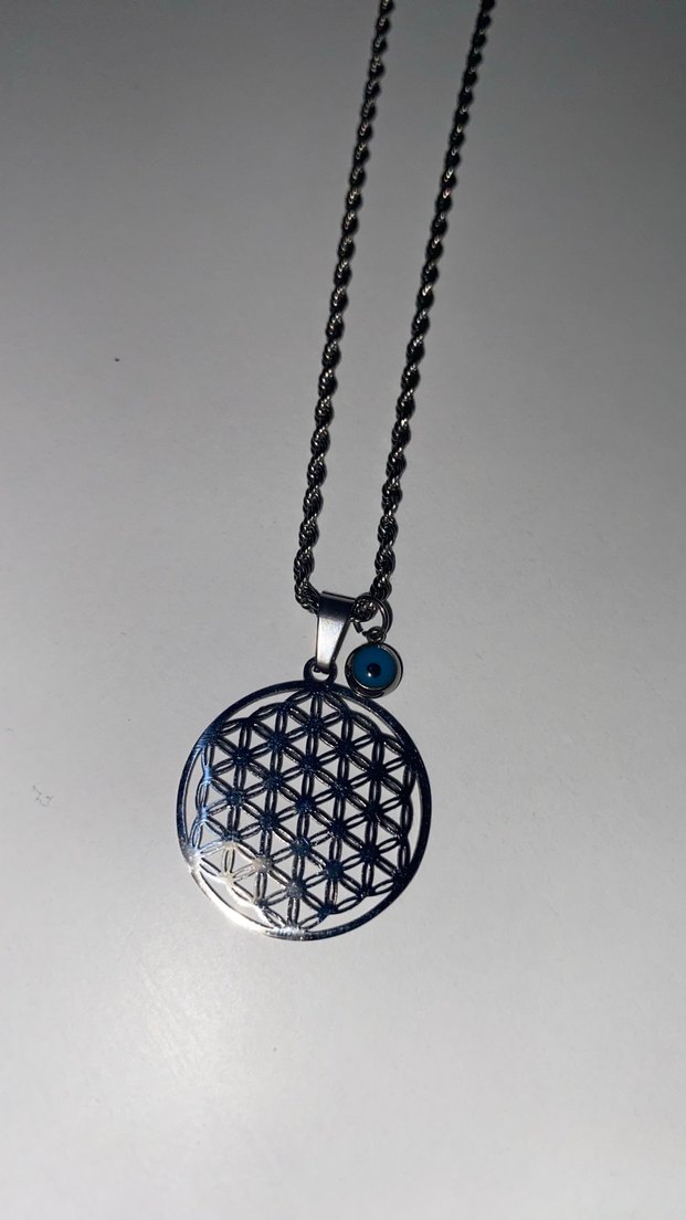 Lacivert renkte, işlemeli desenli kolye ucu ve detaylı zinciriyle midi uzunlukta bohem ve minimal tarzda bir kolye.