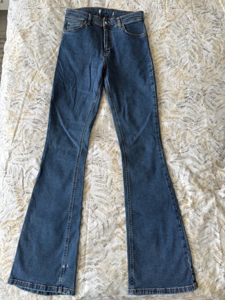 Lacivert renk, dar kesim denim kot pantolon. Bohem ve retro tarzda günlük kullanıma uygun. Ürün yenidir. Ölçüleri; bel 36cm, boy 108cm.
