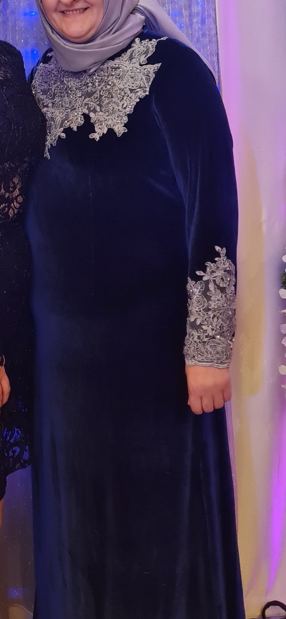Lacivert kadife boncuk Yakalı Uzun Abiye Elbise