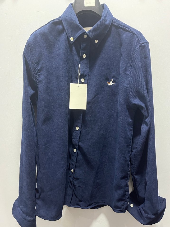 Lacivert kadife erkek gömlek, uzun kollu ve düğmeli ön kısmıyla dikkat çeker. Normal kesim ile ofis ve günlük kullanıma uygundur. Göğüs kısmında baskı detayı bulunur.