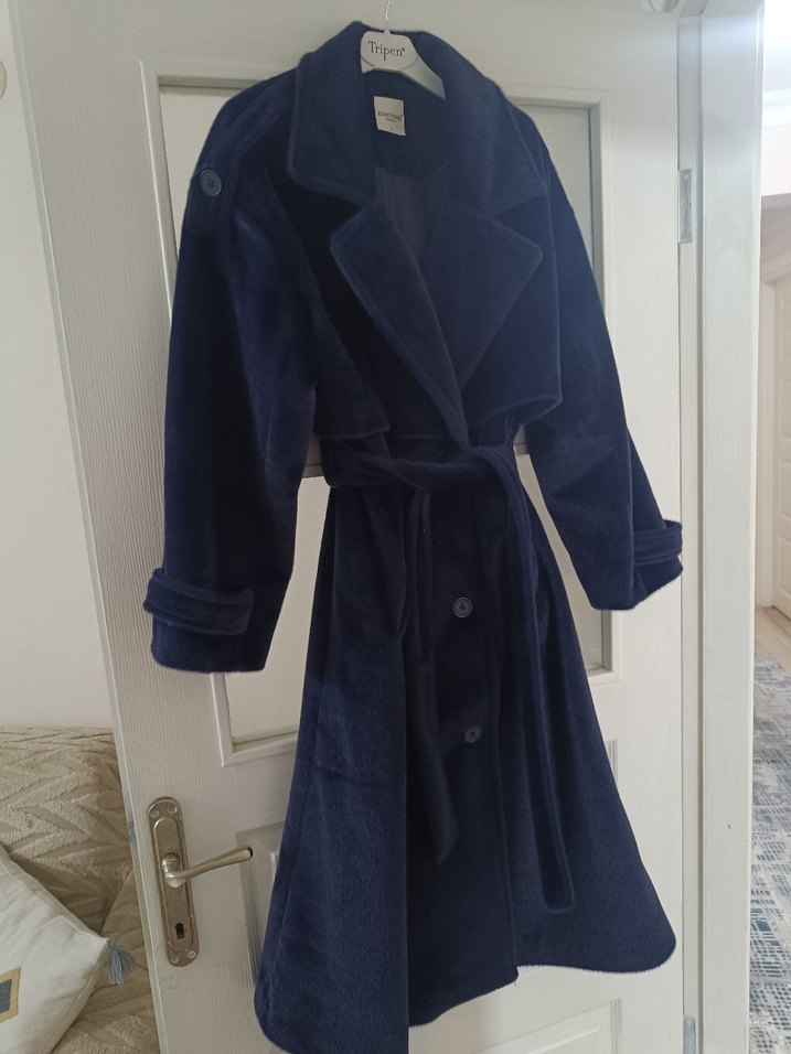 Lacivert kadife dokulu, kemerli ve düğmeli klasik şık kaban. S M L bednlere uyum sağlar