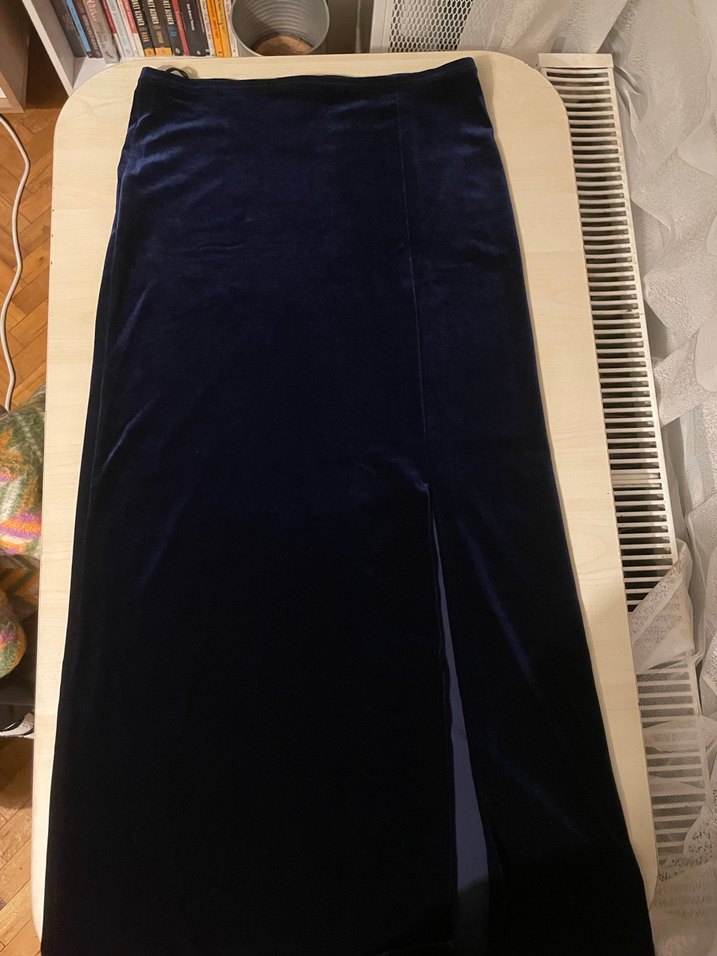 Lacivert ve kadife, yırtmaçlı muhteşem bir etek. 38 bedendir, bol olduğu için ve kesimini bozmak istemediğim için daraltmadım. Sorunsuzdur.