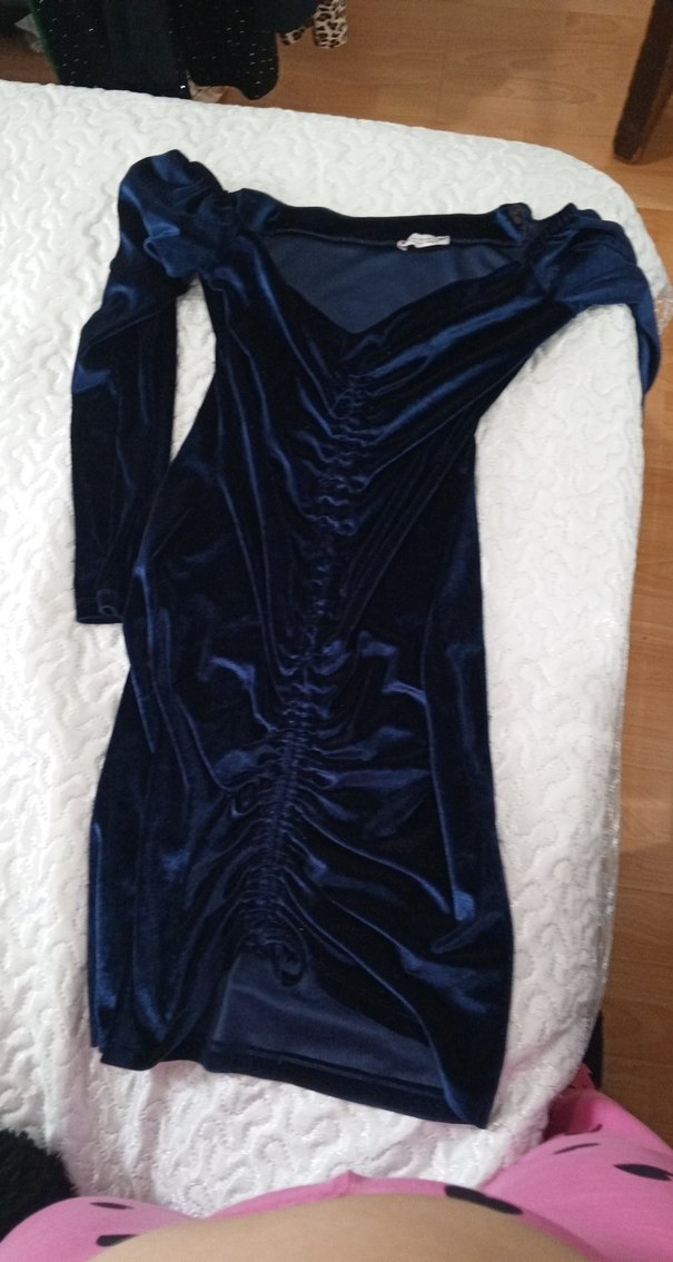 Lacivert kadife kumaştan, uzun kollu ve V yakalı, vücuda oturan drapeli gotik tarz elbisedir. Romantik akşamlar için uygundur.