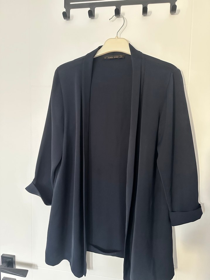 Lacivert midi uzunlukta, dökümlü ve bol kesim kadın blazer. İpeksi kumaştan, uzun kollu ve ofis için uygun minimal tarzda.