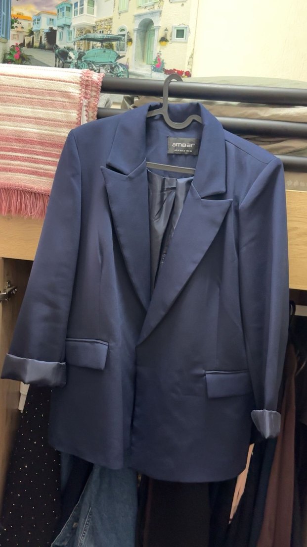 Lacivert kadın blazer ceket, düğmeli ve kesik yakalıdır. Normal midi boyda, uzun kollu ve düz renklidir. Ofis ve günlük kullanıma uygundur. ✨