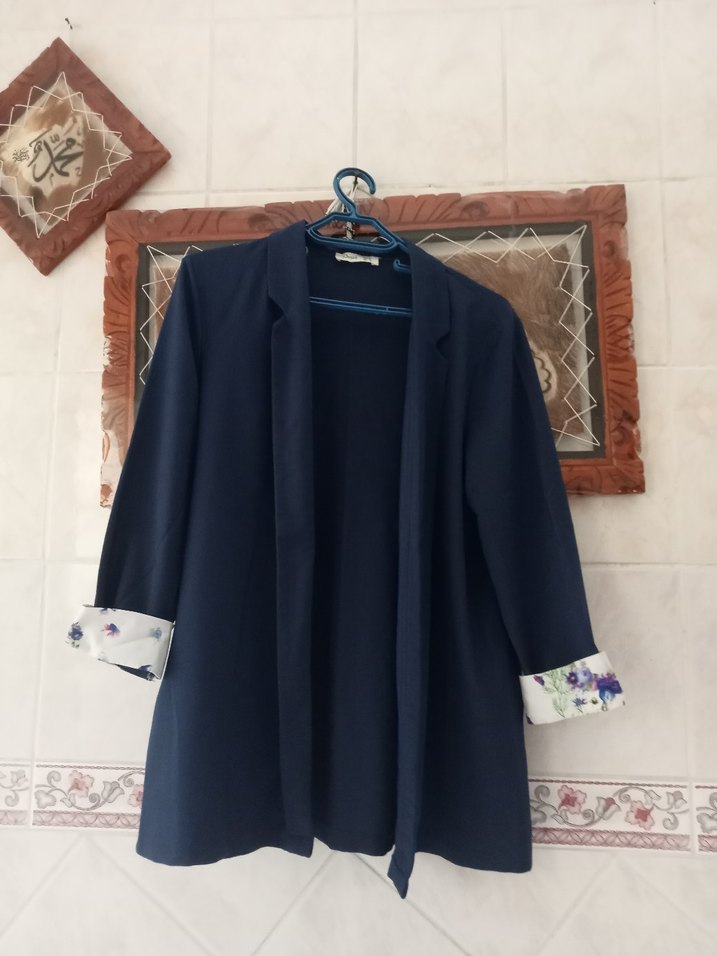 Baskılı manşetli uzun kollu, regular fit, uzun boy lacivert kadın blazer. Ofis için uygun, sentetik kumaştan yapılmıştır.