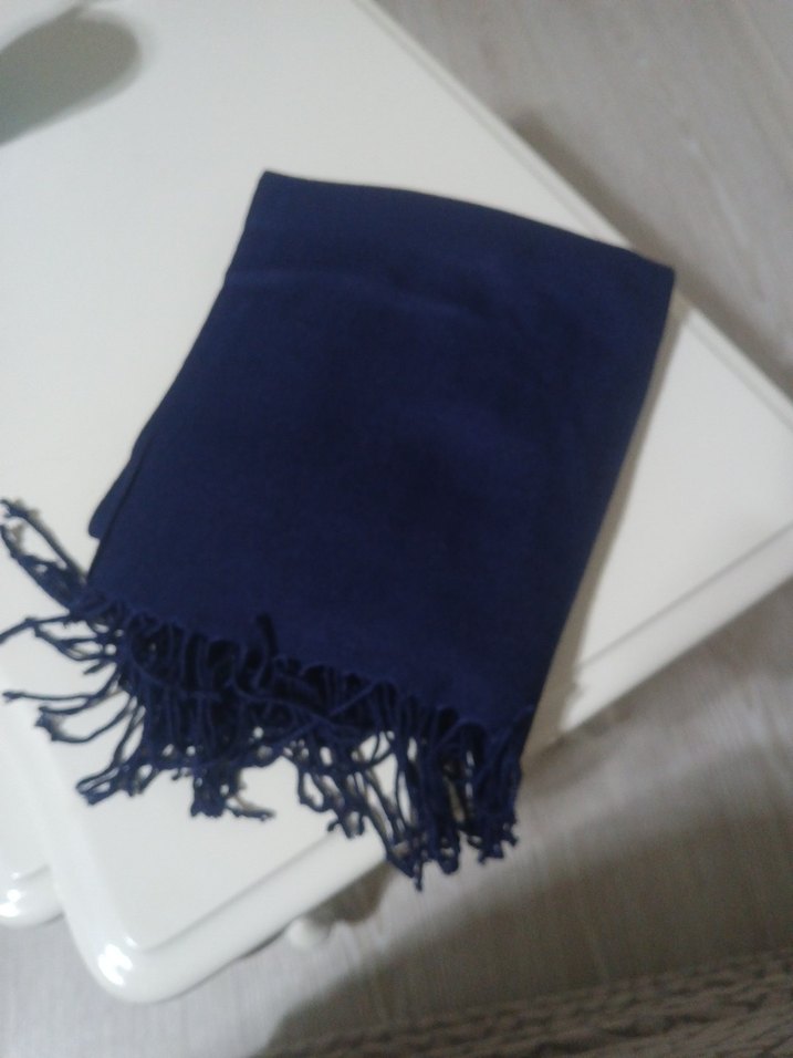 Lacivert renkte, yumuşak ve sıcak kumaştan yapılmış, püsküllü drapeli kadın şalı. Bohem ve mütevazı tarz için uygundur.