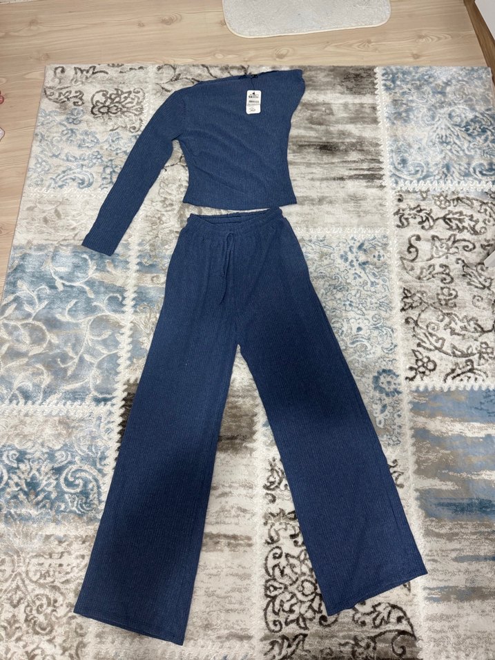Bol kesim, uzun lacivert takım, günlük kullanım için zahmetsiz şıklık sunar. Desensiz tasarımı rahat ve trend bir tarz yaratır.