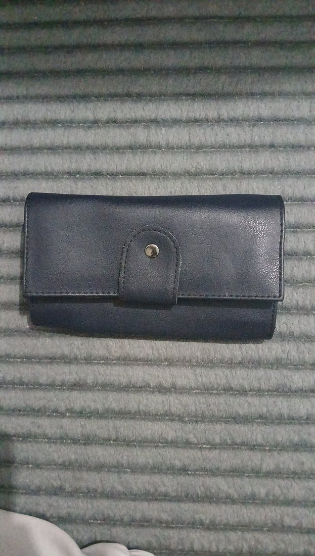 Lacivert kadın cüzdanı, tokalı kapama ve desen içermeyen minimalist tasarıma sahiptir, günlük kullanım için uygundur.