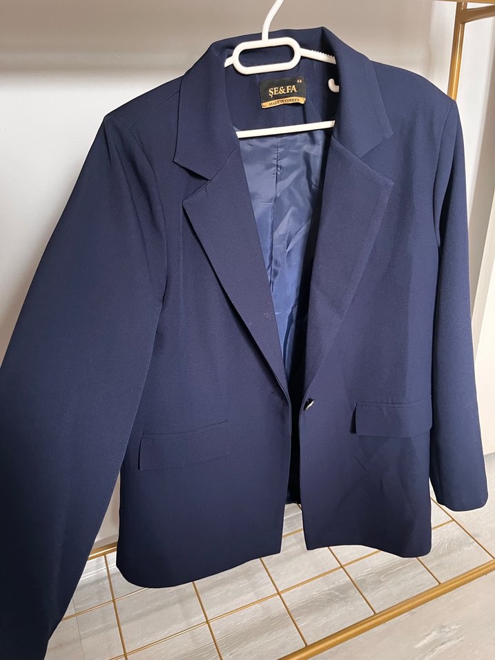 Lacivert renkli, düğmeli, normal boy midi kesim kadın denim blazer. Uzun kollu, regular fit ve desen içermeyen tasarımıyla ofis ve günlük kullanıma uygundur. Sırt kısmında tüylenmeleri vardır.