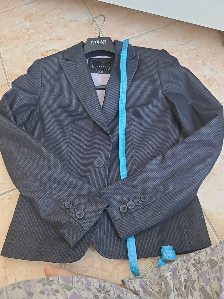 laciverti renkte, tek düğmeli, regular fit denim kadın blazer. Midi boy, strappy kollu, ofis ve streetwear tarzına uygun. koton markalı.
