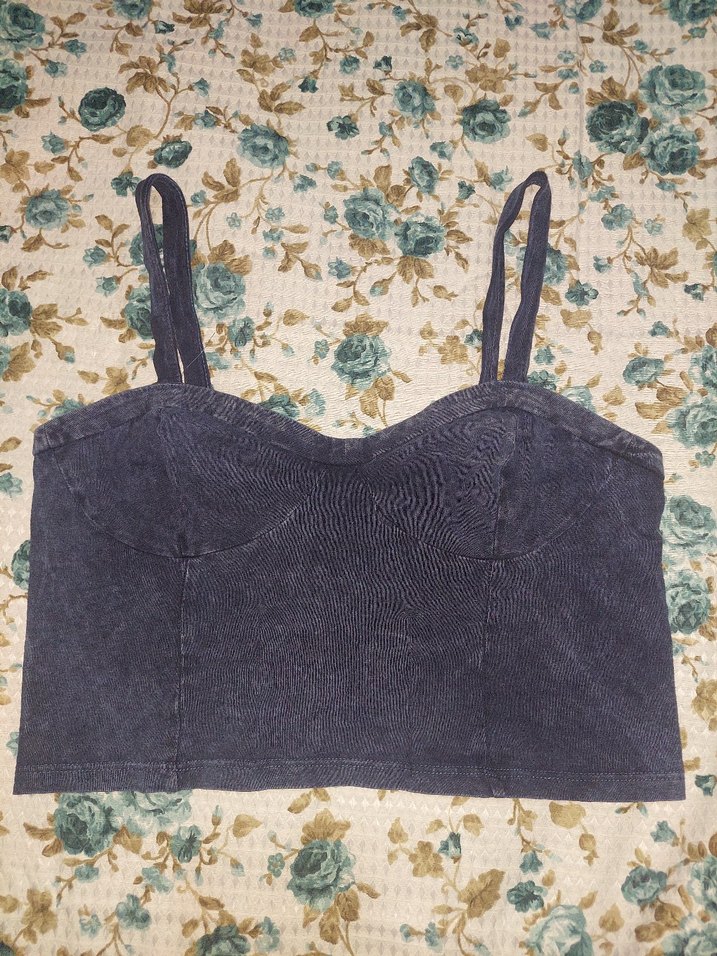 Lacivert renkli, kolsuz ve askısız yakaya sahip, bohem vintage tarzında, vücuda oturan denim büstiyer. ✨