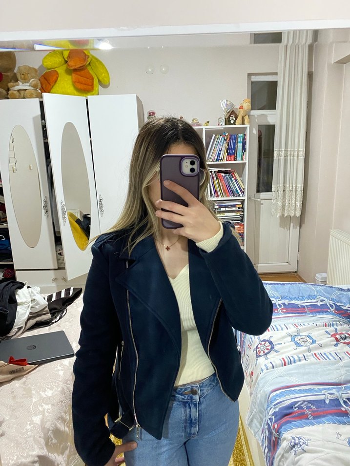 Fitted kesim, uzun kollu lacivert denim ceket, notch yakalıdır. Günlük kullanıma uygun, rahat ve şık bir sokak stili sunar.
