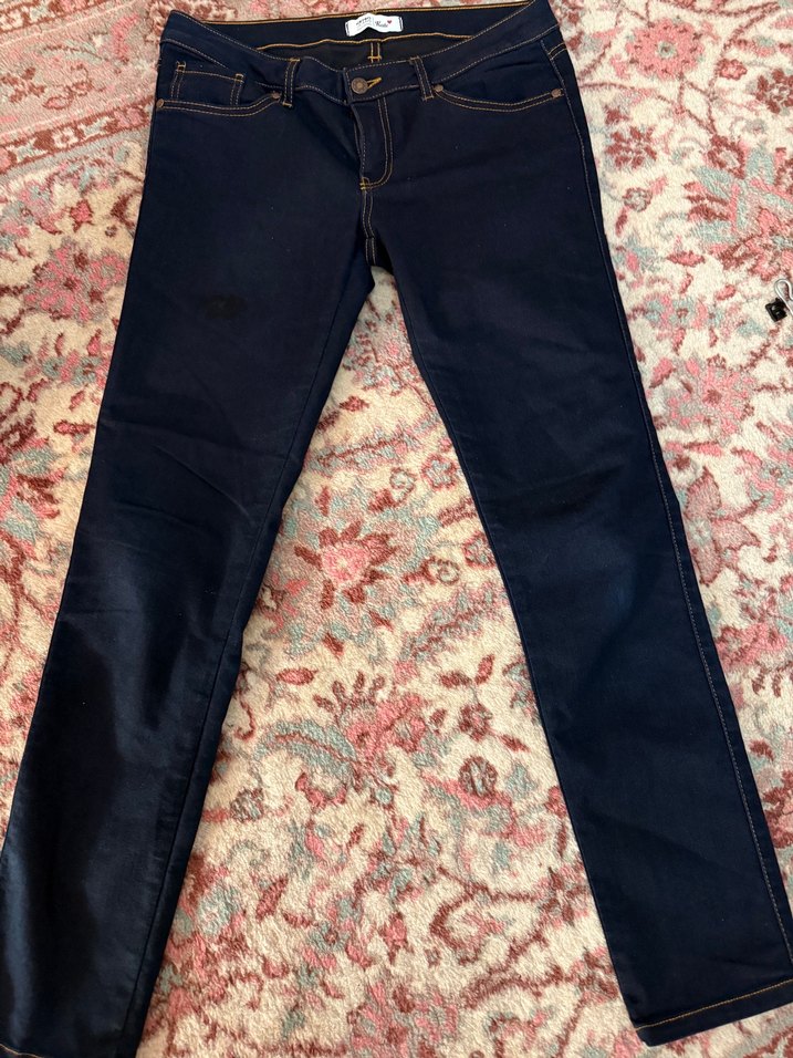 Lacivert renkte, normal boy ve regular fit kesime sahip kadın jean pantolon. Fermuarlı detay ve hafif batik desen içerir, günlük kullanıma uygundur.