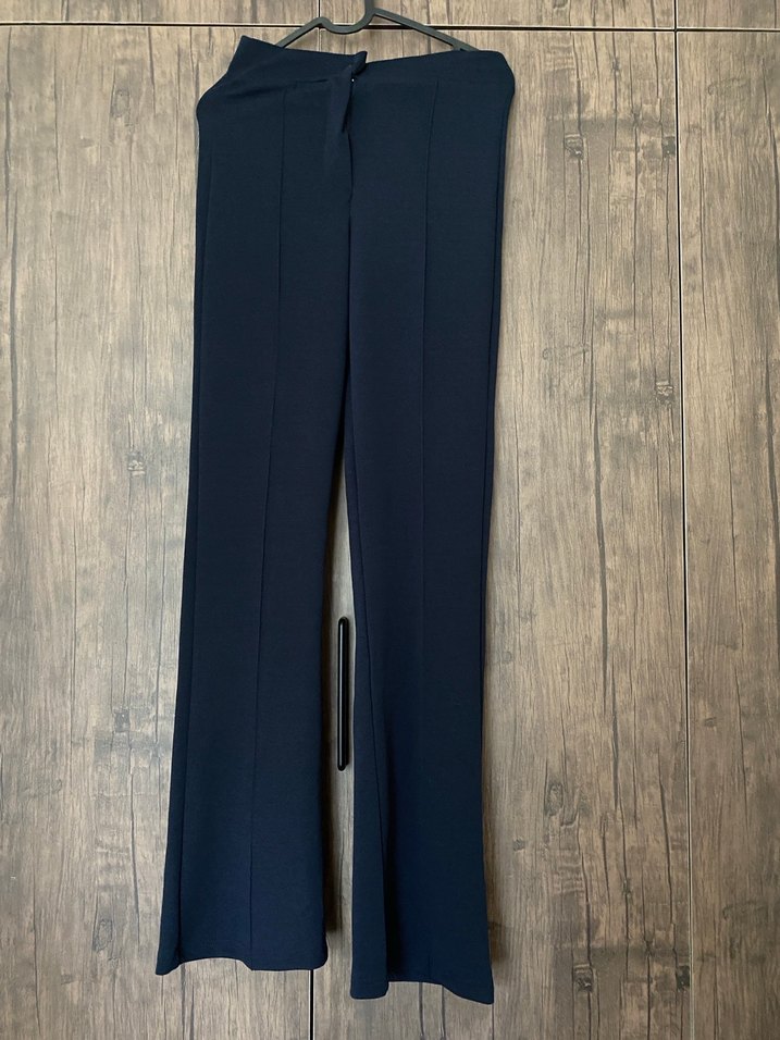 Lacivert renkte, regular fit kesime sahip kadın denim kumaş pantolon. Midi boy ve yırtmaç detaylı, iş ortamına uygun sade tasarım.