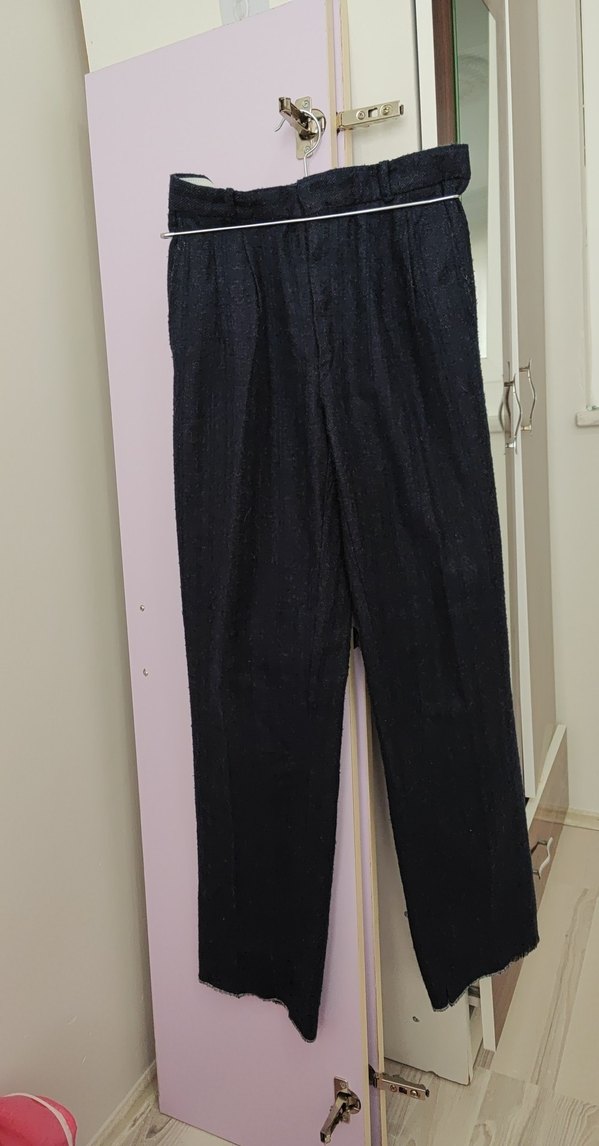 Lacivert renkli, piliseli detaylara sahip, midi boyda ve normal kesim kadın denim pantolon. Ofis kullanımı için uygun, sade ve normcore tarzda.