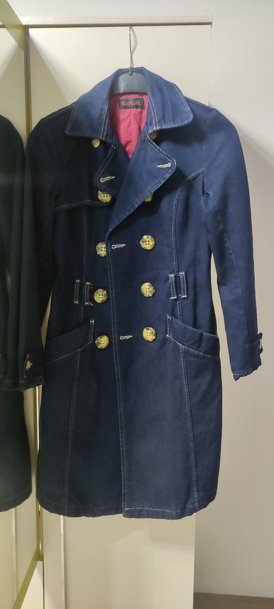 Lacivert kadın denim uzun trençkot, düğmeli ve çıtçıtlı önüyle Paris tarzı sokak modasını yansıtıyor. Regular fit ve uzun kolludur.