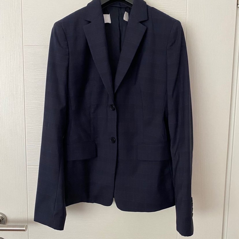 Lacivert renkli, düğmeli ve uzun kollu, klasik kesim kadın blazer cekettir. Sentetik kumaştan yapılmış, ofis için uygun sade ve desensiz tasarıma sahiptir.