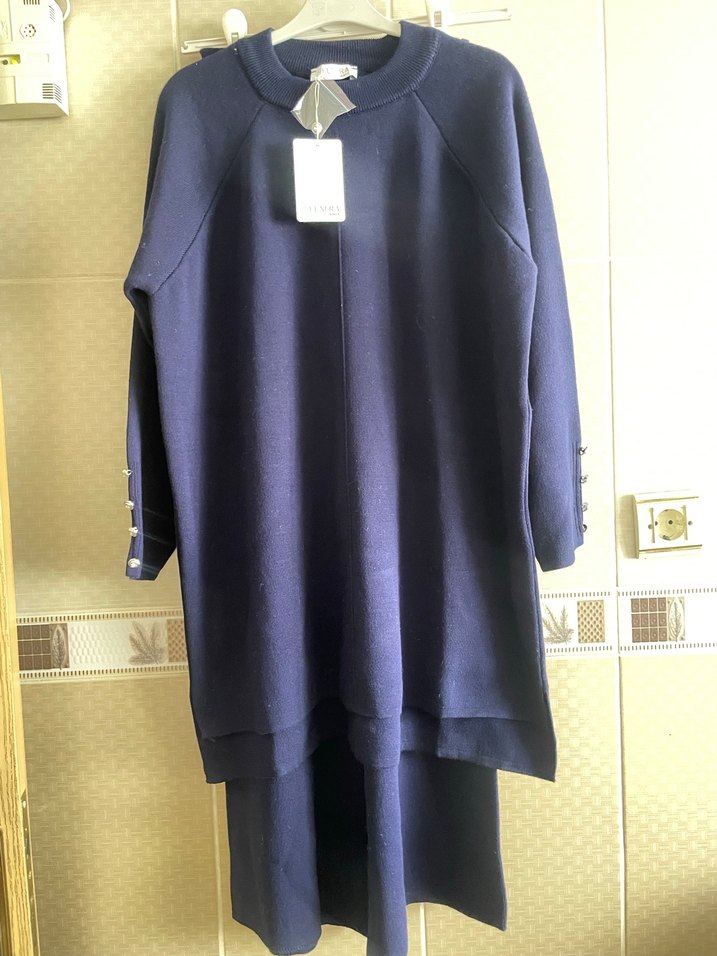 Lacivert renkte, düğmeli ve uzun kollu, yumuşak ve sıcak dokulu triko takımSalaş kesimi ve yuvarlak yakasıyla günlük kullanıma uygun.
