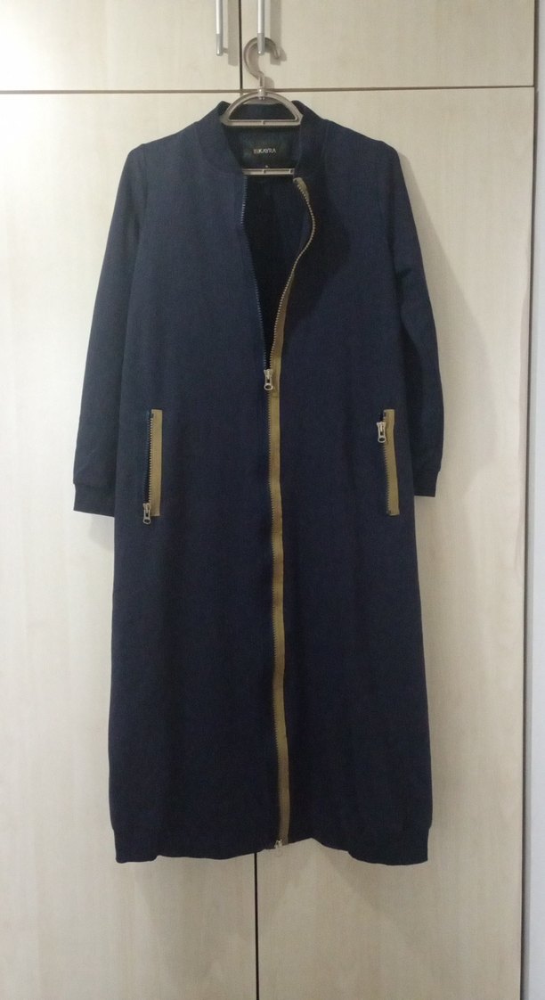 Lacivert, uzun boy kadın 2 iplik giy-çık, fermuarlı cepler ve yakalıdır. Yumuşak ve esnek kumaştan, sade ve şık tasarıma sahiptir. Günlük kullanıma uygundur. Boyu 118 cm dir.