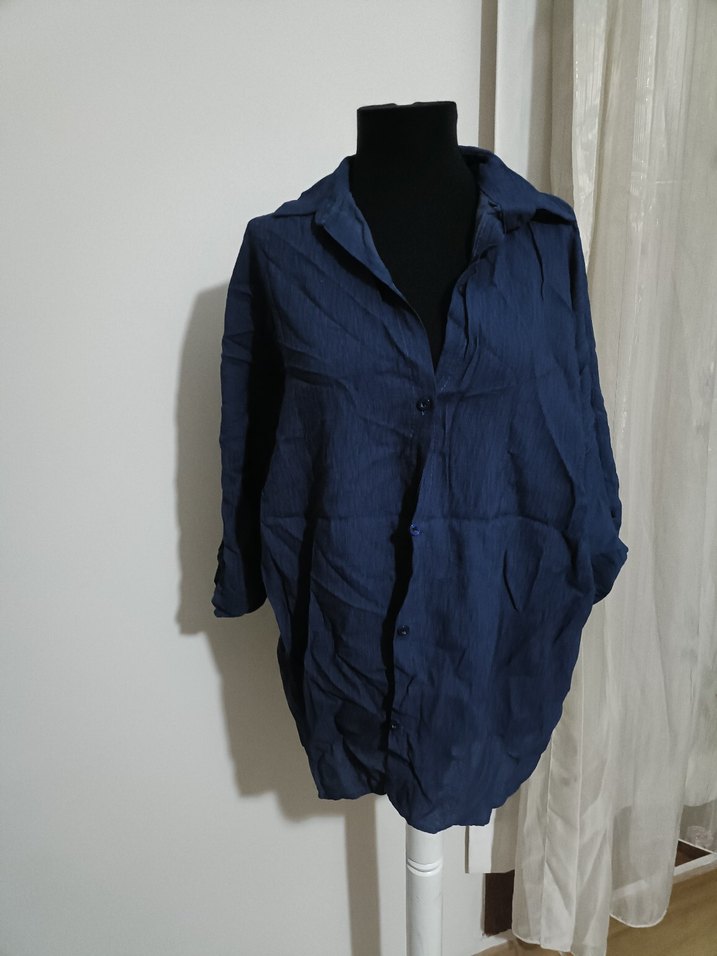Lacivert gömlek, yakalı ve uzun kolludur. Düğmeli ve bol kesimdir, günlük rahat kullanım için uygundur.