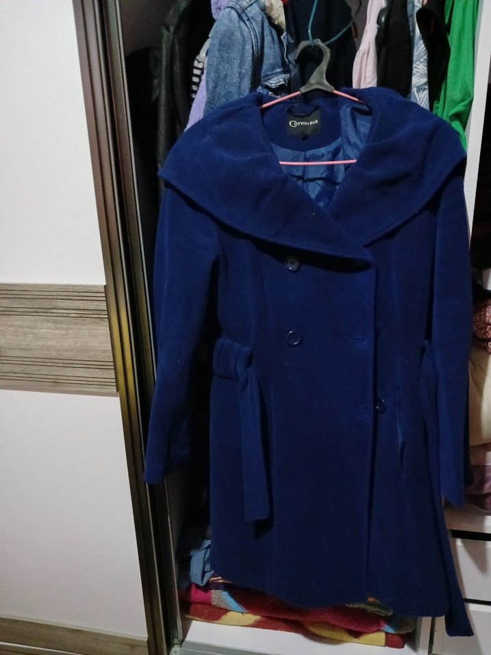 Lacivert renkte, geniş yakalı, çift düğmeli ve kemerli kadın kabanı. Soğuk havalar için sıcak tutar.