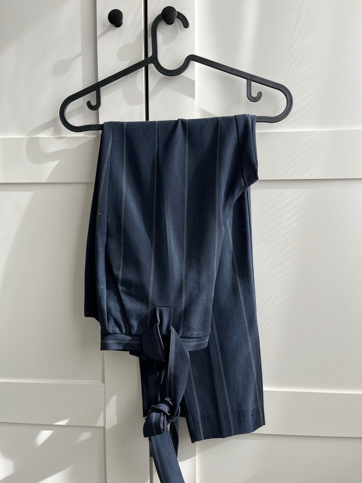Lacivert, kemerli, normal boyda, ipeksi kumaştan kadın pantolon. Minimalist ve normcore tarzıyla ofise uygun.