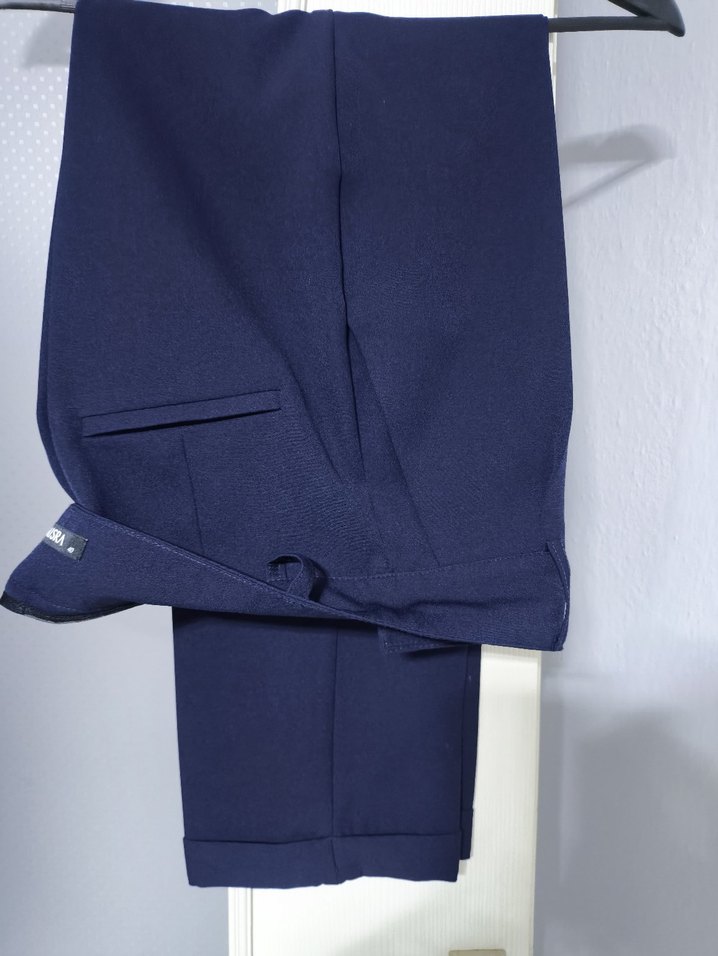 Lacivert renkte, kemerli ve normal boy midi kesim kadın kumaş pantolon. Ofis kullanımı için uygun, sade ve desensiz tasarım.