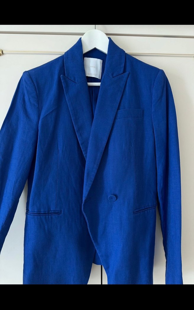 Lacivert keten kumaştan, düğmeli, uzun kollu kadın blazer. Normal kesim ve midi boyda, ofis için uygun sade ve şık tasarım.