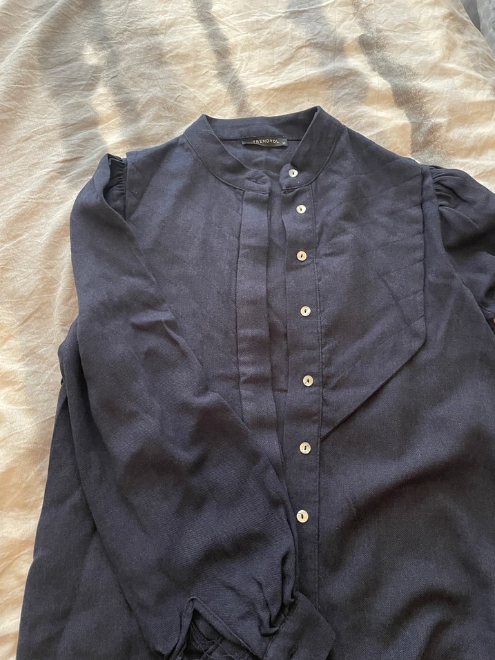 Lacivert renkte, keten kumaştan üretilmiş, uzun kollu ve yakalı kadın gömleği. Düğmeli ön kısmı ve bol kesimi ile günlük rahat kullanım için uygundur.