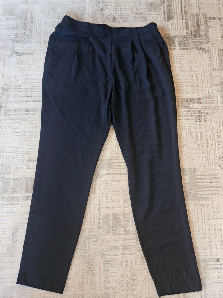 Lacivert keten kumaştan, bol kesim ve pilili, midi boy kadın pantolon, günlük rahat kullanım için uygundur.