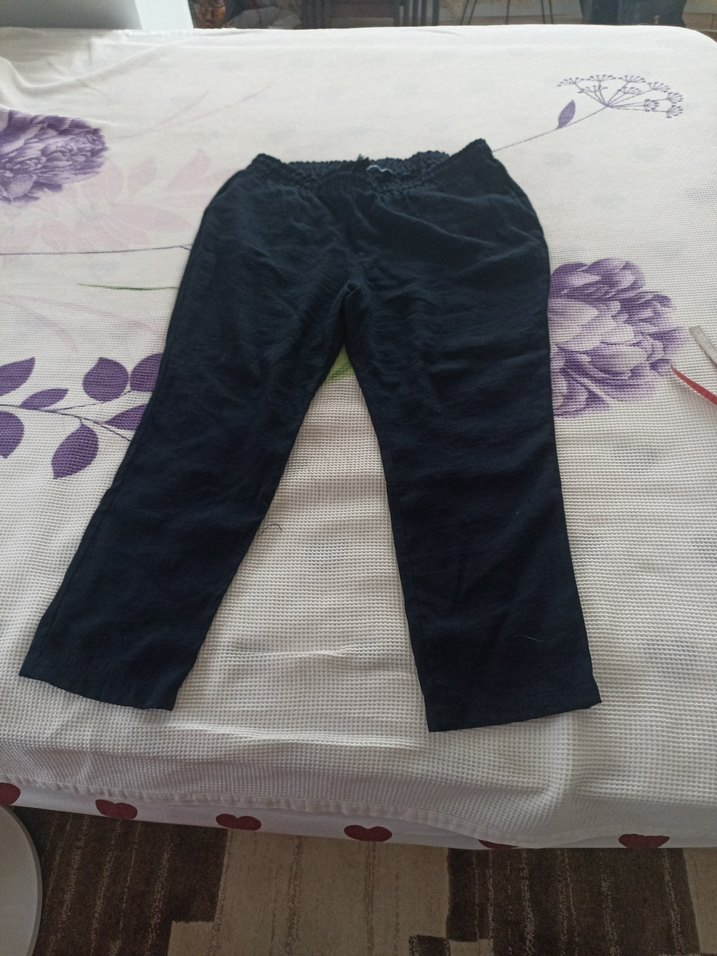 Lacivert keten kumaştan, elastik bel bandına sahip, rahat kesim ve midi boy pantolon. Günlük kullanım için uygundur.