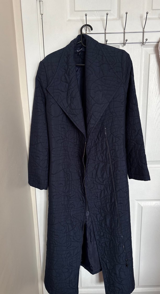 Lacivert keten kumaştan, uzun kollu ve yakası kesik detaylı kadın palto. Dökümlü, düz kesim ve desensiz yapısıyla ofis kullanımı için uygundur.