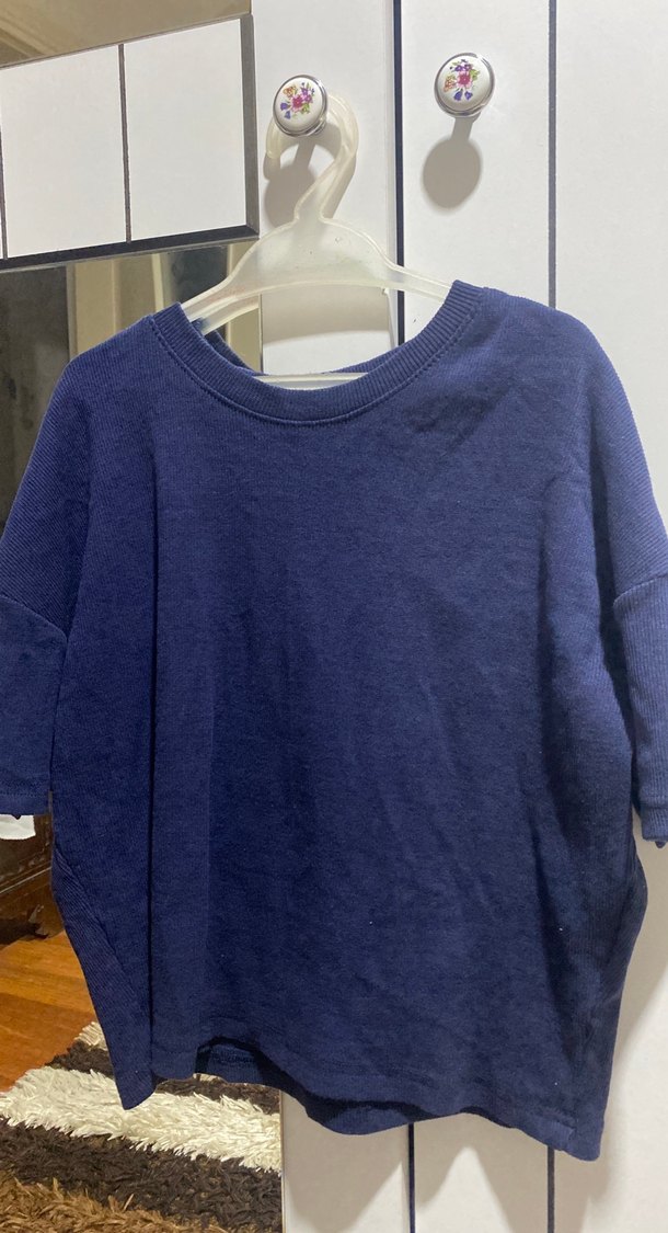 Lacivert renkli, yuvarlak yaka ve kısa kollu kadın sweatshirtü. Rahat kesimi ve yumuşak, sıcak kumaşıyla günlük kullanıma uygun sade ve şık bir modeldir.