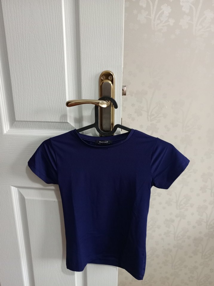 Koyu lacivert renkli, kısa kollu, yuvarlak yakalı, ince kesim kadın tişörtü. Satenimsi kumaştan, minimal ve rahat günlük stil için uygun.