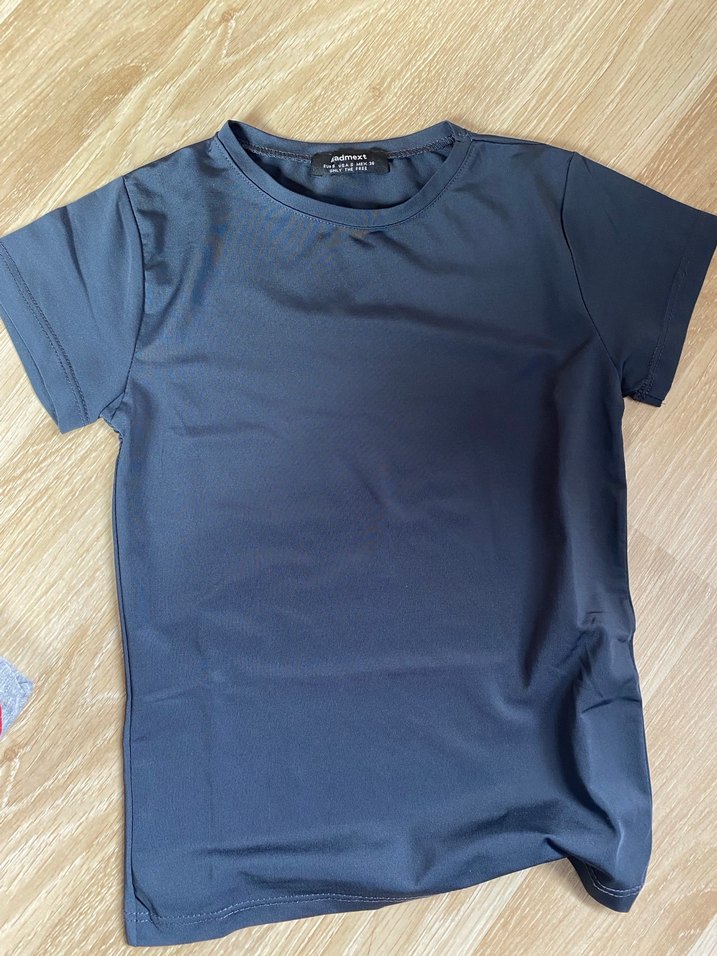 Lacivert renkli, kısa kollu ve bisiklet yaka kadın tişörtü. Düz ve dar kesim, yumuşak sentetik kumaş. Hiç giyilmedi.